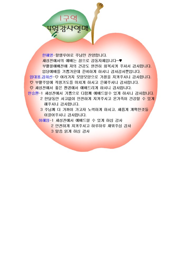 2020.4월 감사열매 1구역 작성자 김유경 작성일20-07-09 18:40 조회476회 댓글0건 관련링크 목록 본문 2020.4월 감사열매 1구역 댓글목록 등록된 댓글이 없습니다. 목록