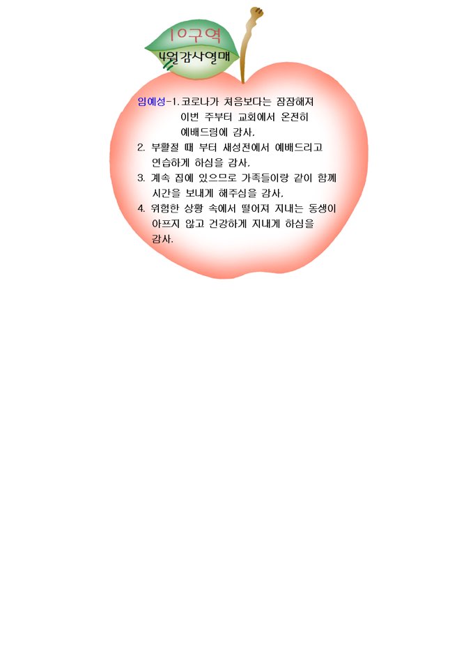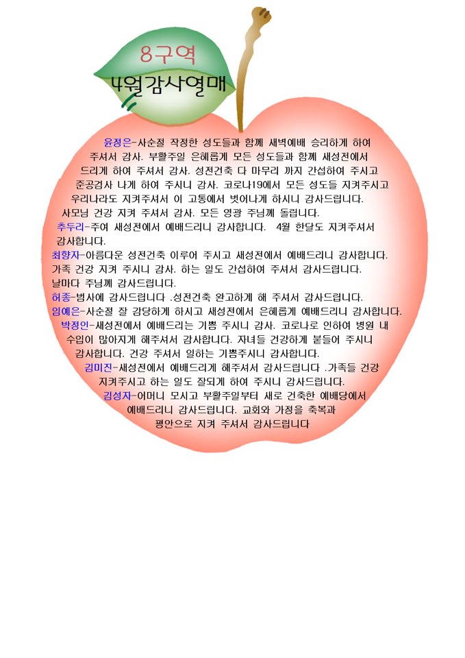 2020.4월 감사열매 8,10구역 작성자 김유경 작성일20-07-09 18:47 조회492회 댓글0건 관련링크 목록 본문 2020.4월 감사열매 8,10구역 댓글목록 등록된 댓글이 없습니다. 목록