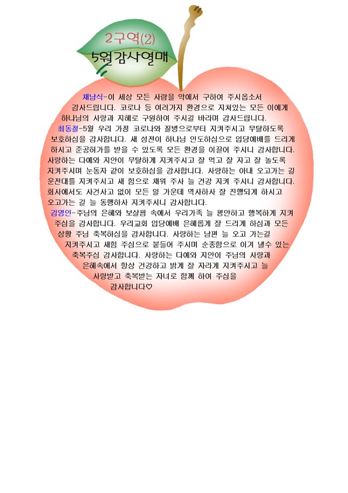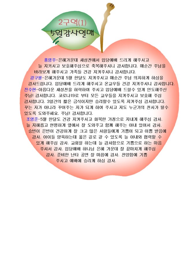 2020.5월 감사열매 2구역 작성자 김유경 작성일20-07-09 18:54 조회493회 댓글0건 관련링크 목록 본문 2020.5월 감사열매 2구역 댓글목록 등록된 댓글이 없습니다. 목록