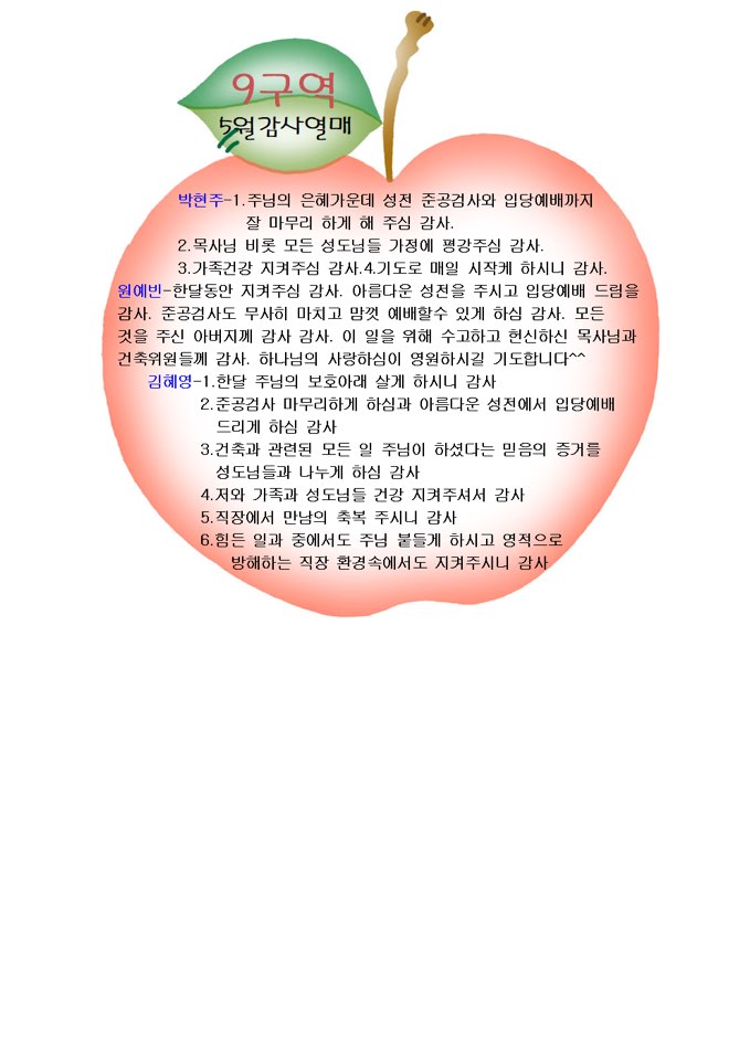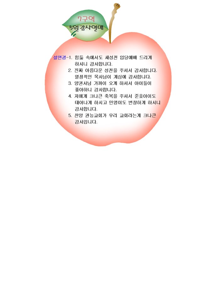 2020.5월 감사열매 7,9구역 작성자 김유경 작성일20-07-09 18:58 조회614회 댓글0건 관련링크 목록 본문 2020.5월 감사열매 7,9구역 댓글목록 등록된 댓글이 없습니다. 목록